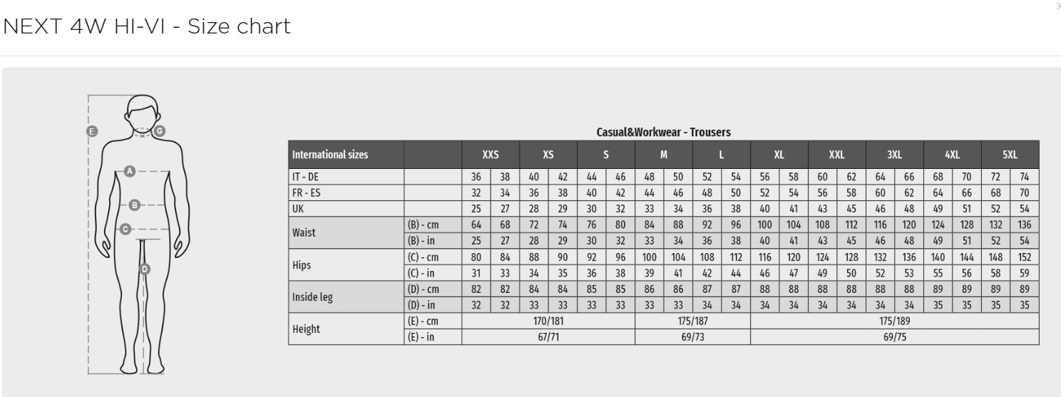 - Datasheet - https://www.payperwear.com/cat/gb-en/casual-workwear/trousers/trousers/next4whi-vi