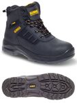 Black leather waterproof safety boot with steel toe cap and steel midsole protection. Waterproof & breathable inner membrane lining. PU/Rubber outsole heat resistant to 300 degrees c. Comfort PU insole.