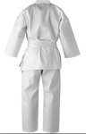 Suitable for multiple Martial Art disciplines. Smart, classic suit. Ideal for any club. Precision woven, cotton-rich, polycotton weave to minimise suit shrinkage; allowing the suit to retain its shape and prolong durability. Jacket has an elastic and button down skirt to hold in place, with a v-neck opening. Additional slits either side of the jacket for unrestricted movement. Ankle to ankle gusset enabling practitioners to comfortably perform leg techniques with ease. Lightweight material, that glides over the skin effectively, to enhance freedom of movement. Cuffs and hems have 8 rows of stitching for superior strength. Trousers have an elastic/tie waist. Plain, minimalistic design allows suit to be personalised with club logos and associations. Small woven Blitz label on left of jacket skirt and top of left leg. White belt included. 65% cotton/35% polyester. 7oz.